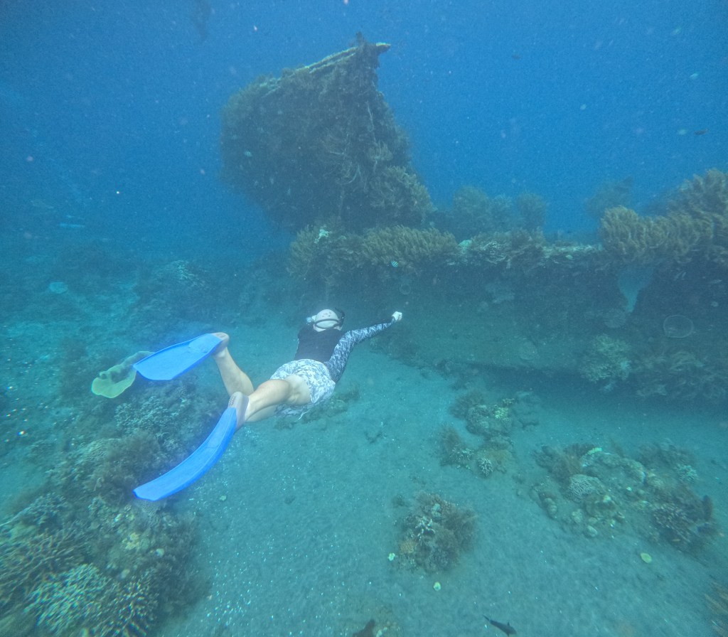 The next morning our first stop was a motorbike rental shop where we picked up their cheapest little scooter. We rented some gear too and set off. Struggling with the inclines we roared around on that tiny bike. After a few wrong turns and a breakfast smoothie at altogether the incorrect location we arrived at the site of the Japanese Wreck. No sooner had we arrived than we were in the water. The wreck was not far out and only a short swim from the beach. An unreal sight it was to see the full length of the ship laying on the ocean floor. We spent some hours exploring the old patrol boat that was sunk under mysterious circumstances during World War II. The boat is teeming with life now and the number of fish and coral present was mind-blowing. Heading back to the beach I realised that equalizing as we dove around the wreck had caused my nose to bleed. It had done so on the dives the day before, but I had paid it little attention as the instructor with us had passed it off as normal. The fact that it was happening at such shallow depths stressed me out a little although another guide dispelled my worries when I asked him about it.