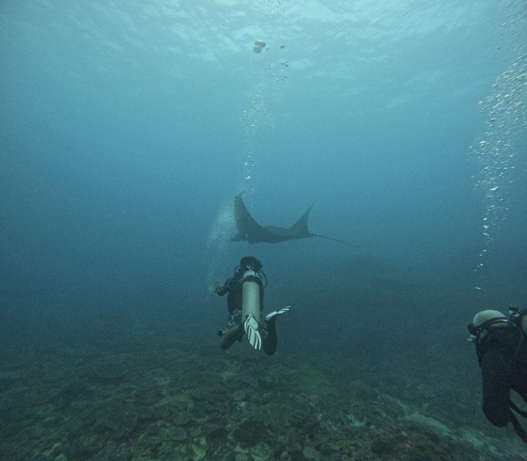 We awoke very early and motored across the island to squeeze in a quick breakfast and coffee before meeting up with a man named Keef at the dive shop. He was a super chill Indonesian man and soon we were geared up and headed out on the boat. The trip was a long one as the dive site was on the next island over, Nusa Penida. Soon enough we arrived. The swell was gnarly and rocked the boat rather seriously as we strapped on our tanks and made ready for the descent. We had arrived at Manta Point. Unsure what exactly to expect we back rolled into the turbulent white water and began our descent. Reaching the bottom anticipation was at an all-time high. In no time at all Keef gave a point and there, appearing out of the gloom came a manta ray. With powerfully slow flaps of its wings, it approached and drifted close above our heads. The awe I felt in that moment is hard to describe. The ray was far bigger than I had imagined and just soared so majestically through the water. Passing far closer than I had ever expected to get to such a magnificent creature. Believing the experience complete we followed Keef along the reef to a large rock which signified a feeding station and there to my utter astonishment we encountered many more of the animals. Each more fascinating than the last, they circled all around, maybe nine or ten in all. Overwhelmed by their otherworldly gliding I barely remembered to breathe. Time stood still and I basked in the absolute immensity of that moment. An eternity passed by in a minute and soon Keef turned us around and we headed back towards the boat. Along the way we encountered a mantis shrimp among other ocean dwellers culminating in the most unbelievable dive. We surfaced and the blood I spat hardly detracted from the experience we had just shared. With the boats passengers giddy as schoolchildren we took off for the next site.